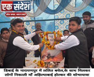 डिबाई क्षेत्र के नारायणपुर गाँव में देवी अहिल्याबाई होल्कर की भव्य शोभायात्रा निकाली गई। शोभायात्रा का मुख्य उद्देश्य समाज के लोगों को देवी अहिल्याबाई होल्कर के जीवन, उनके आदर्शों और समाज के प्रति उनके योगदान के बारे में जागरूक करना रहा। आयोजन को लेकर ग्रामीणों में खासा उत्साह देखने को मिला और बड़ी संख्या में लोगों ने इसमें भाग लिया। शोभायात्रा में युवा नेता ललित बघेल के नेतृत्व में लोगों ने बढ़-चढ़कर हिस्सा लिया। यात्रा के दौरान श्रद्धालुओं ने देवी अहिल्याबाई होल्कर की चित्र प्रतिमा पर माल्यार्पण कर उन्हें नमन किया और उनके बताए मार्ग पर चलने का संकल्प लिया। पूरे गाँव में भक्तिमय और उत्सवपूर्ण वातावरण बना रहा।